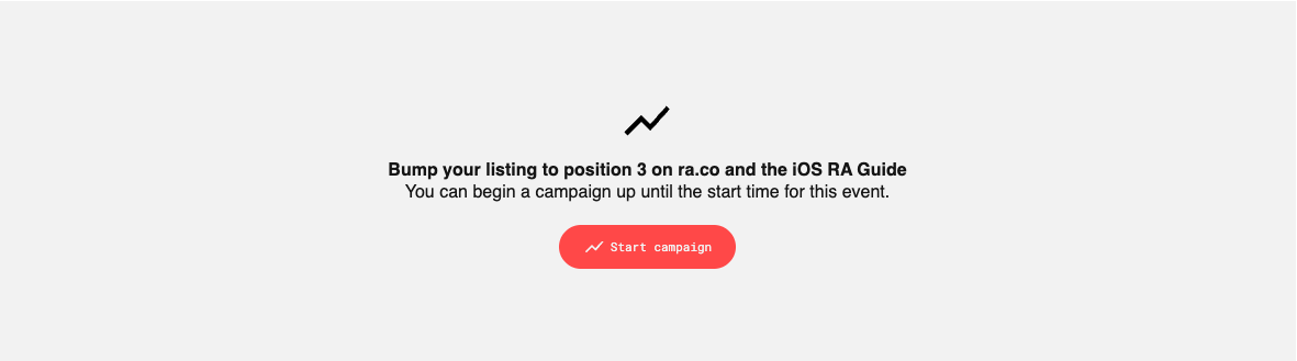 Your campaign will start from the moment you press ‘start campaign’. The ad will be displayed on ra.co and the iOS RA Guide. Your ad will be delivered to a specific pool of users and, given the number of users accessing the website and app, you may not see your ad every time you go to the ra.co or the iOS RA Guide listings. You can keep up to date with the number of users clicking your ad via the live RA Bumps dashboard within RA Pro.